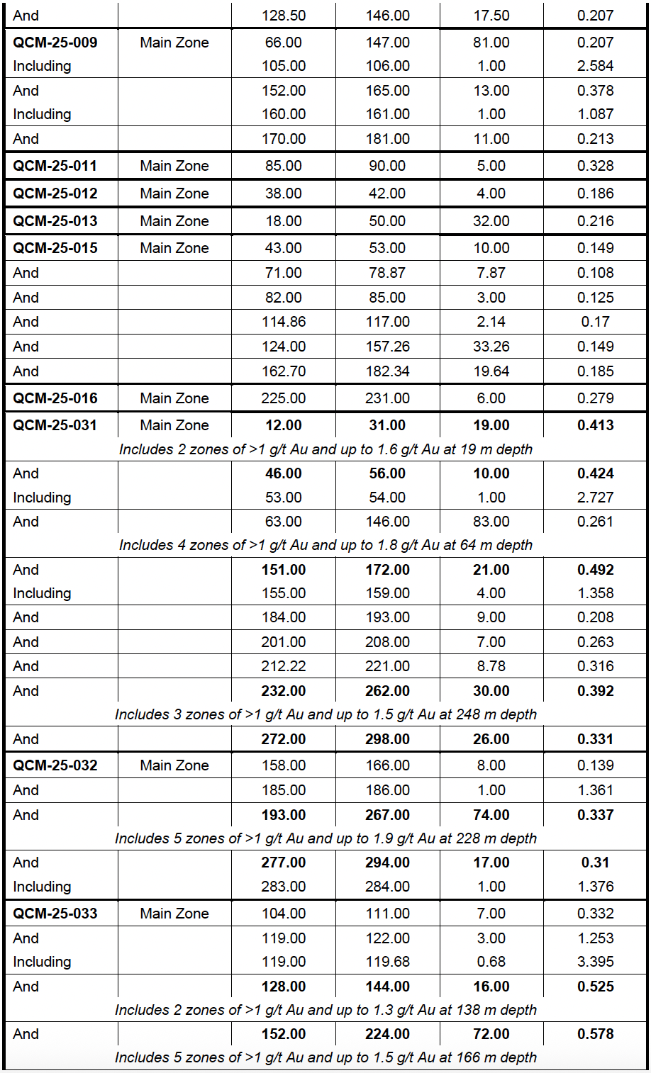 Diamond drill hole QCM-25-035 has several zones with the most robust being 72 m of 0.591 g/t Au starting at 319 metres.