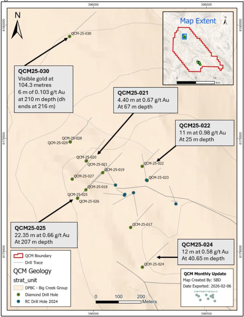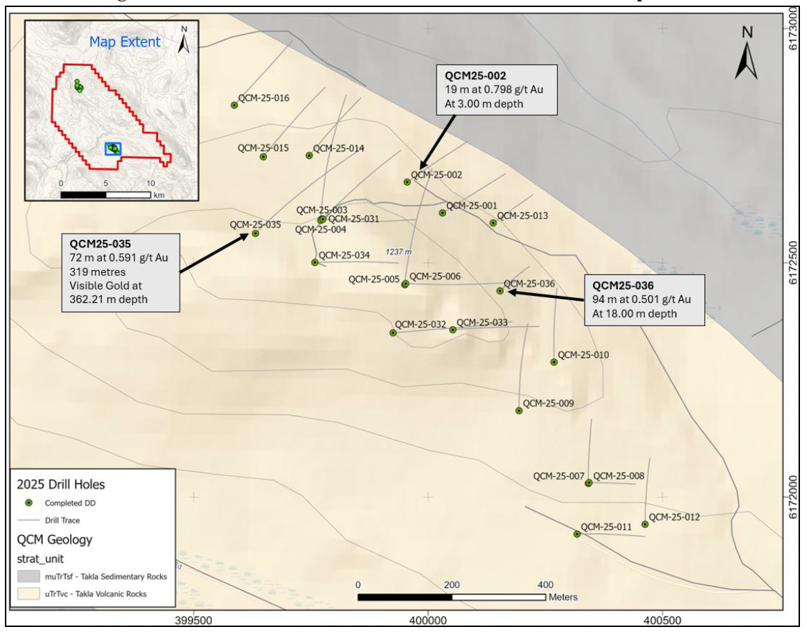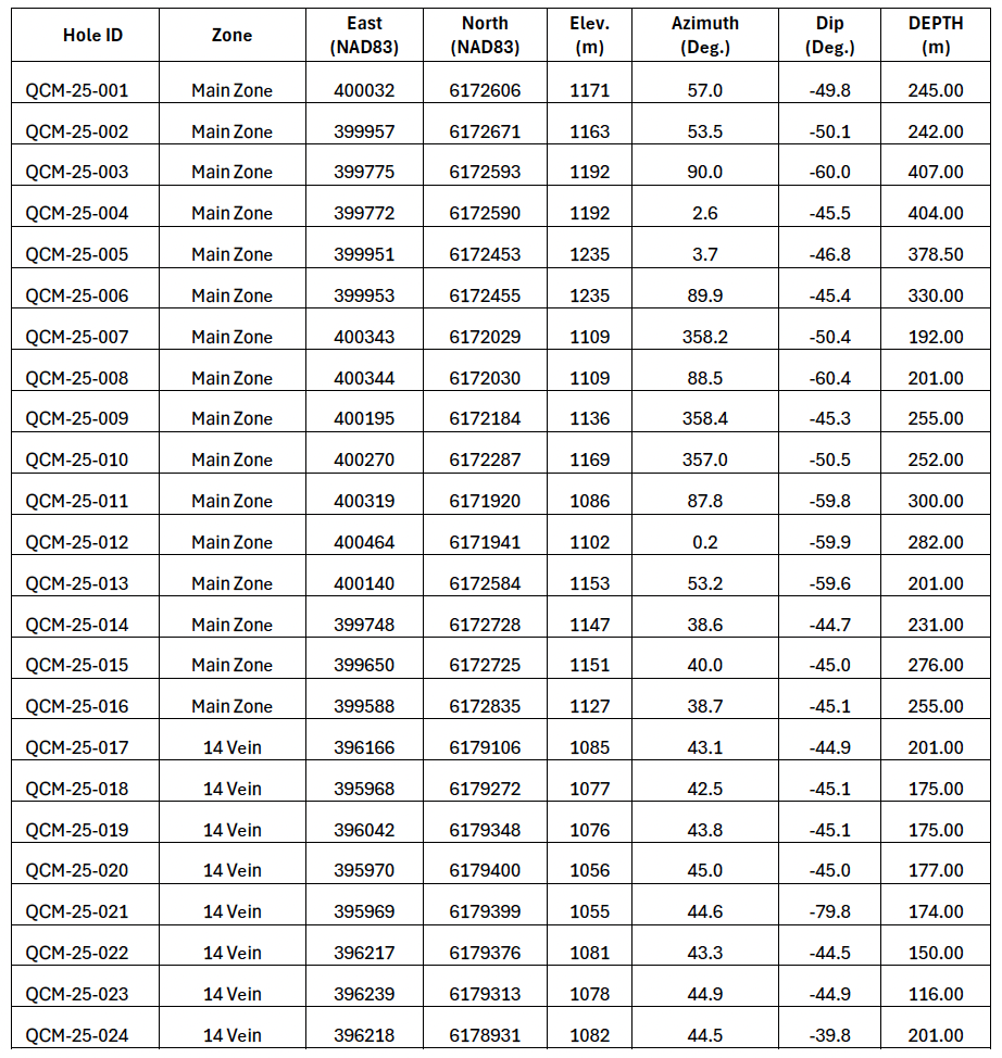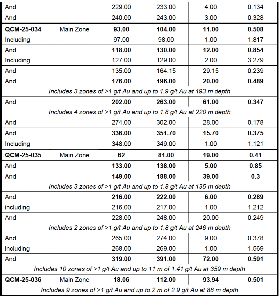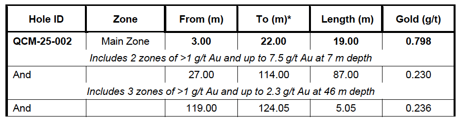 Diamond drill holes QCM-25-018 to 019 returned assay results of up to 25 metres of 0.632 g/t Au from 91.00 metres depth and 17.69 metres of 0.631 from 156 metres depth. Drill hole QCM-25-018 returned four metres of 1.628 g/t Au at 165 metres depth, near to end of this hole at 175 m.
