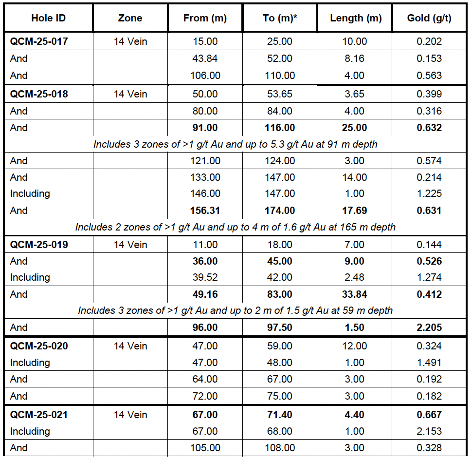 14 Vein - diamond drill intersections up to 33.84 metres of 0.412 g/t Au (drill hole QCM25-019).